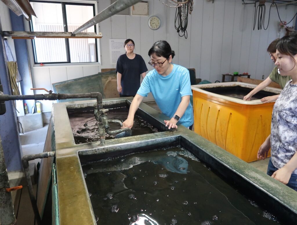 藍染は幼い時に体験をした程度で、綺麗な紺色になるという程度の認識しかなかったのですが、初めて大きな龜に触れ、藍の変化や染め重ねを経験し、就労したことで徳島の藍文化を知ることができました。時間をかけたことで理解でき、身体で学ぶことができたと思います。