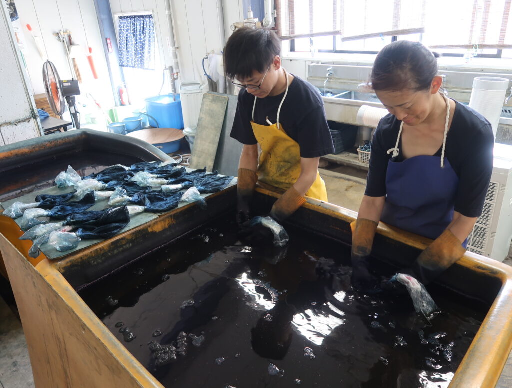 商品になるまでの工程を実際に経験でき、とても貴重でした。染めは一つ一つ手作業で行い、何度も染め直し、洗い、乾燥して完成させるという手間のかけ方に驚きました。