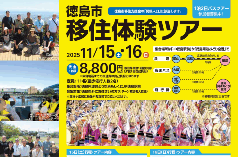 徳島市への移住を検討している方に徳島市の暮らしを体験していただく「徳島市移住体験ツアー」を11月15日(土)〜16日(日)の日程で開催します。 1泊2日の日程で徳島市の魅力や暮らしを体感できる絶好の機会となっておりますの … 続きを読む 【参加者募集】令和7年度徳島市移住体験ツアーを開催します!(11月15日〜16日実施予定)